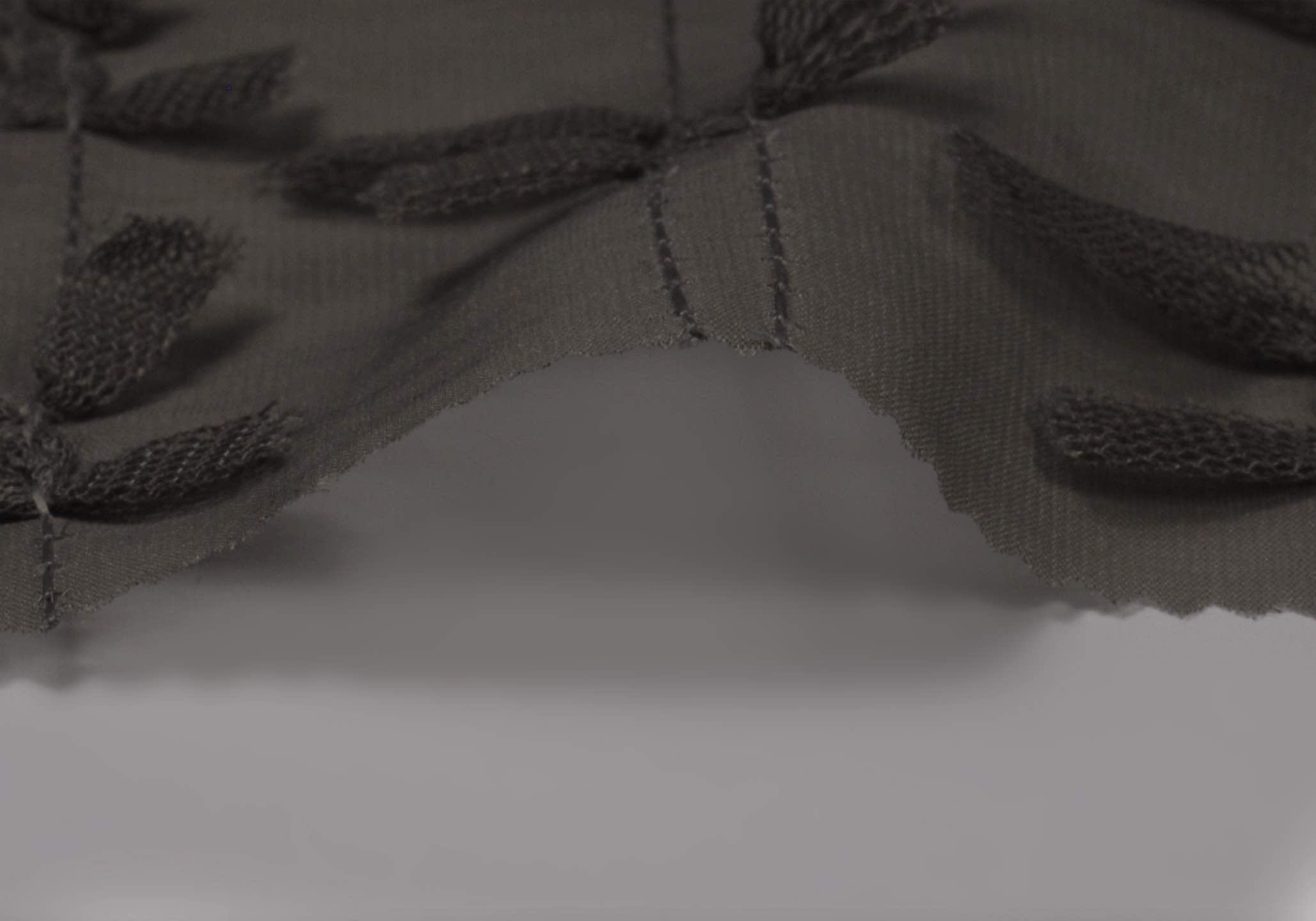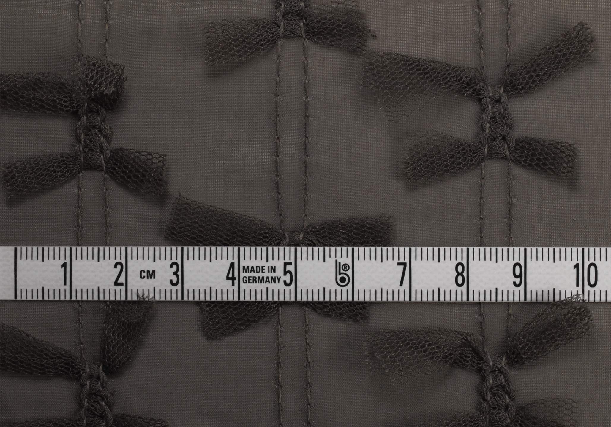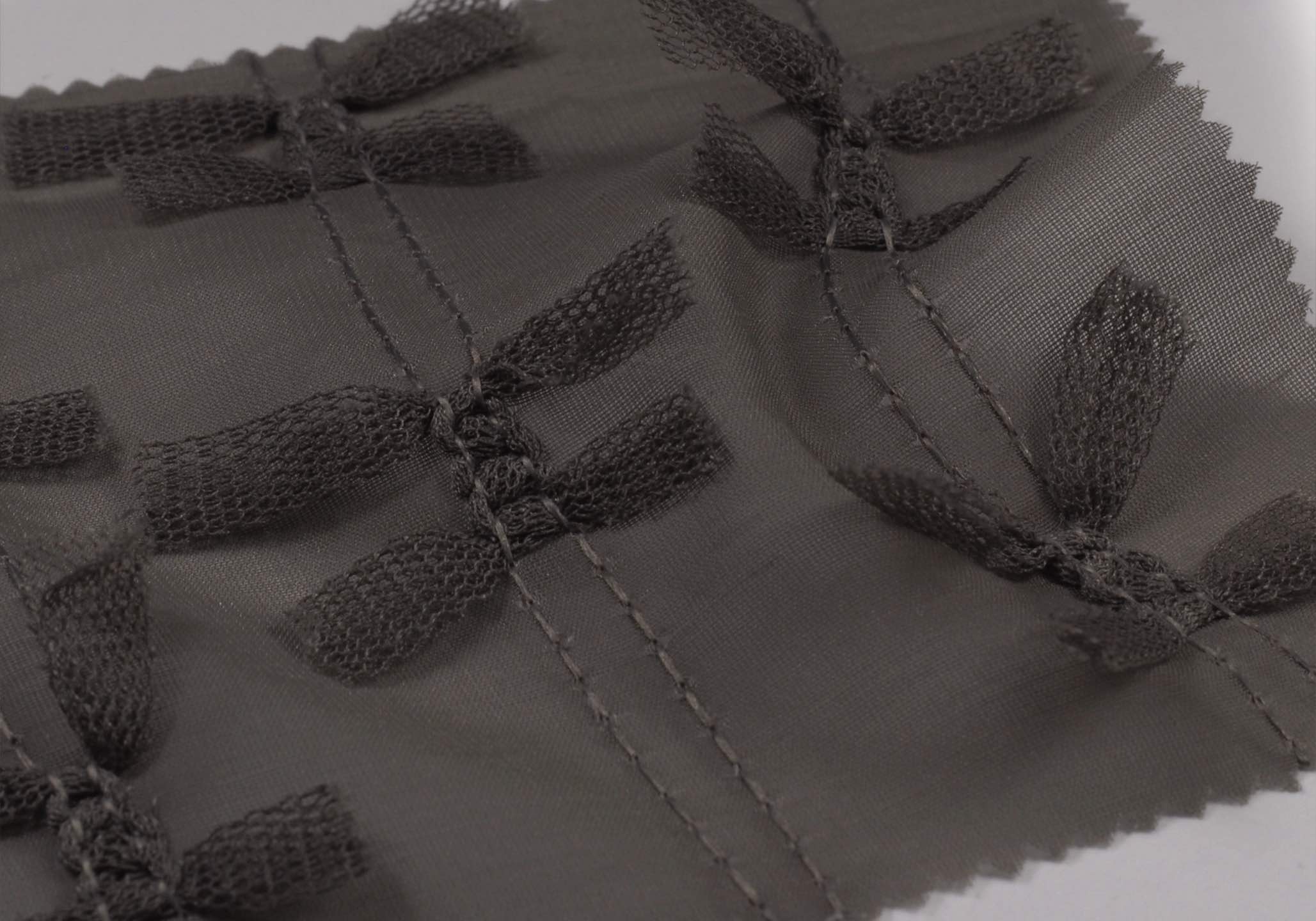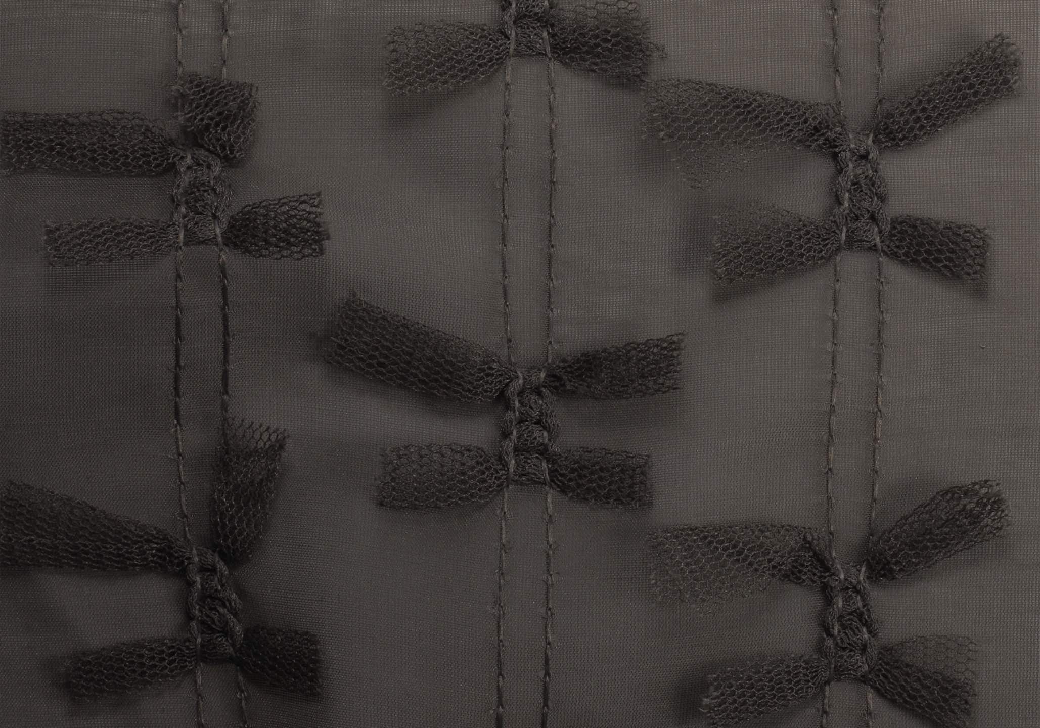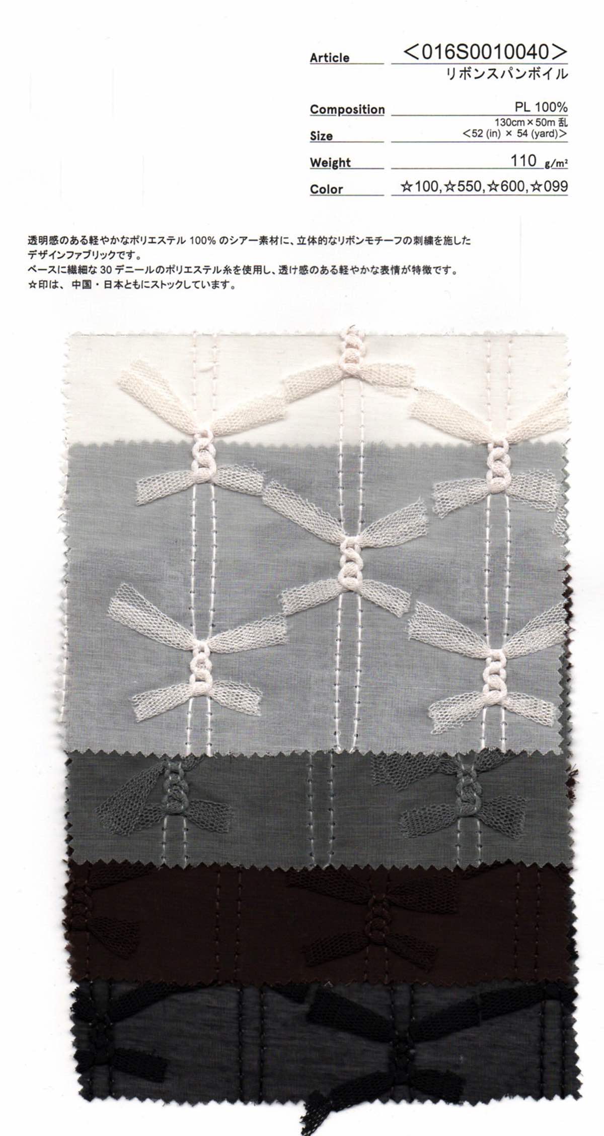 透明感のある軽やかなポリエステル100%のシアー素材に、立体的なリボンモチーフの刺繍を施したデザインファブリックです。