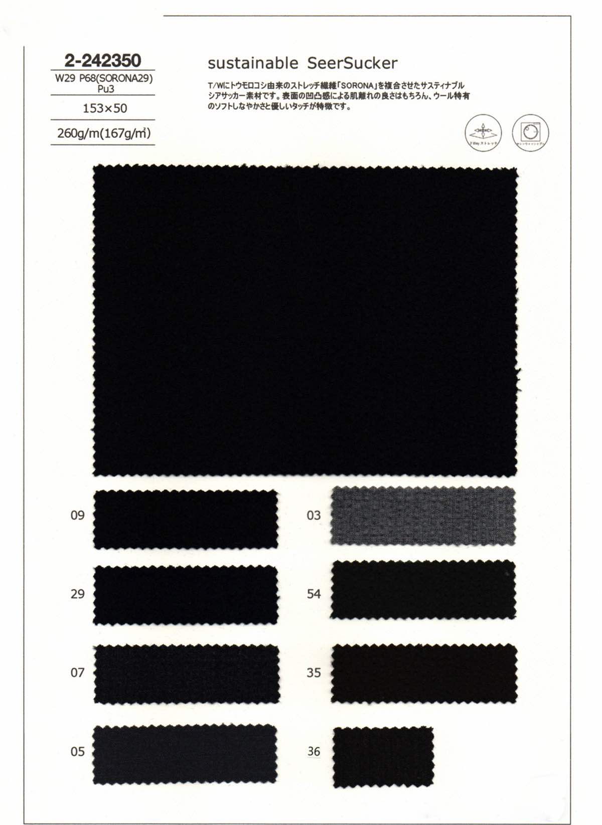 T/Wにトウモロコシ由来のストレッチ繊維「SORONA」を複合させたサスティナブルシアサッカー素材です。