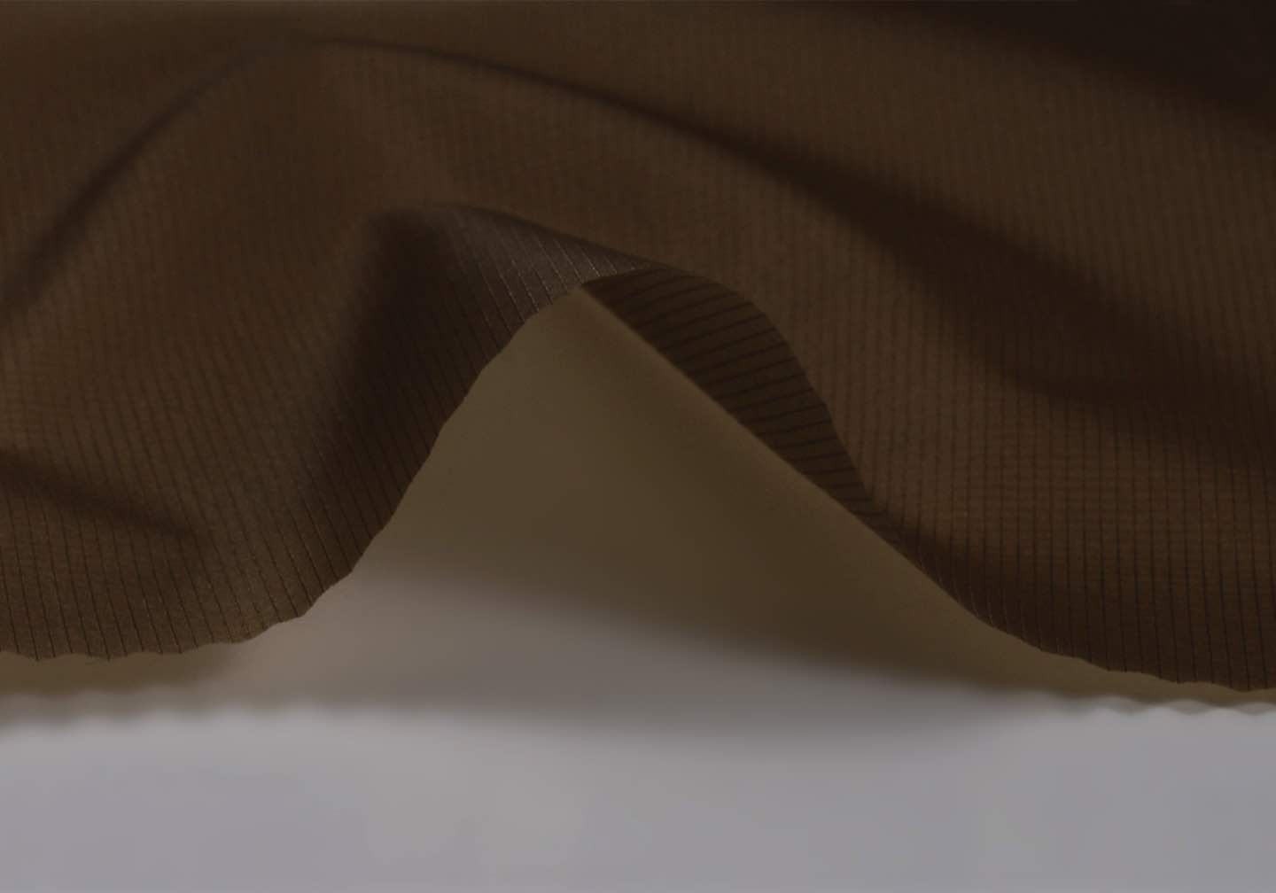 液流染色による細かなシボ感と、裏面に薄く引いたコーティングによる適度なハリコシが、生地の表情を形作り、軽さだけでなく、視覚、触覚を刺激する新素材です。