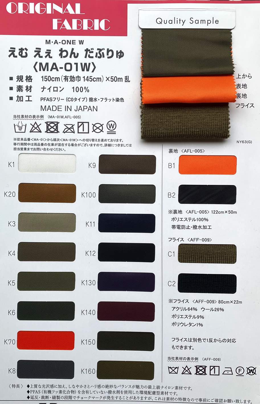 撥水加工 資材向き 特殊衣料向き かばん/雑貨向き アウター向き パンツ向き アウトドア向き ウォッシャブル(シワ軽減) W巾