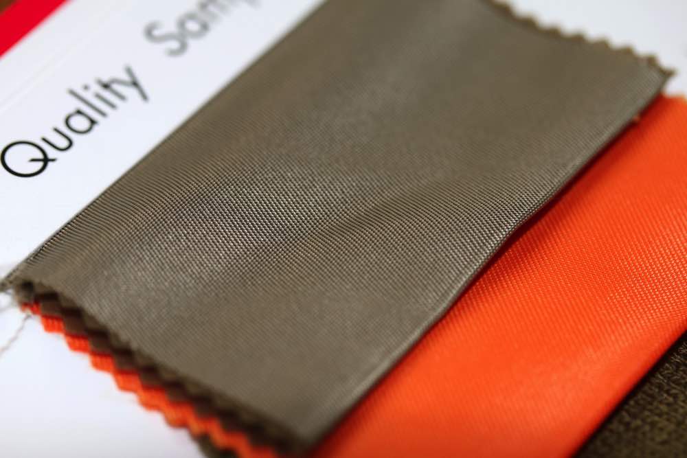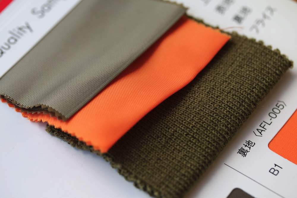 中肉厚でしなやか、つるつるとした表面感と落ち着いたカラー展開が魅力の生地です。撥水機能があり、アウトドアアイテムやカジュアルアイテム、雑貨資材などに向いています。