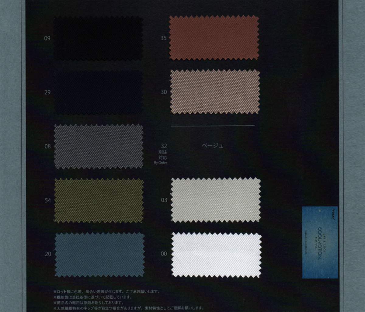 経糸に綿、緯糸にCOOLMOTIONを打ち込んだカルゼ素材。天然素材のナチュラルな肌触りに接触冷感、吸水速乾、ストレッチ、ウォッシャブル性を組み合わせた多機能素材です。パンツにお勧めの素材です。