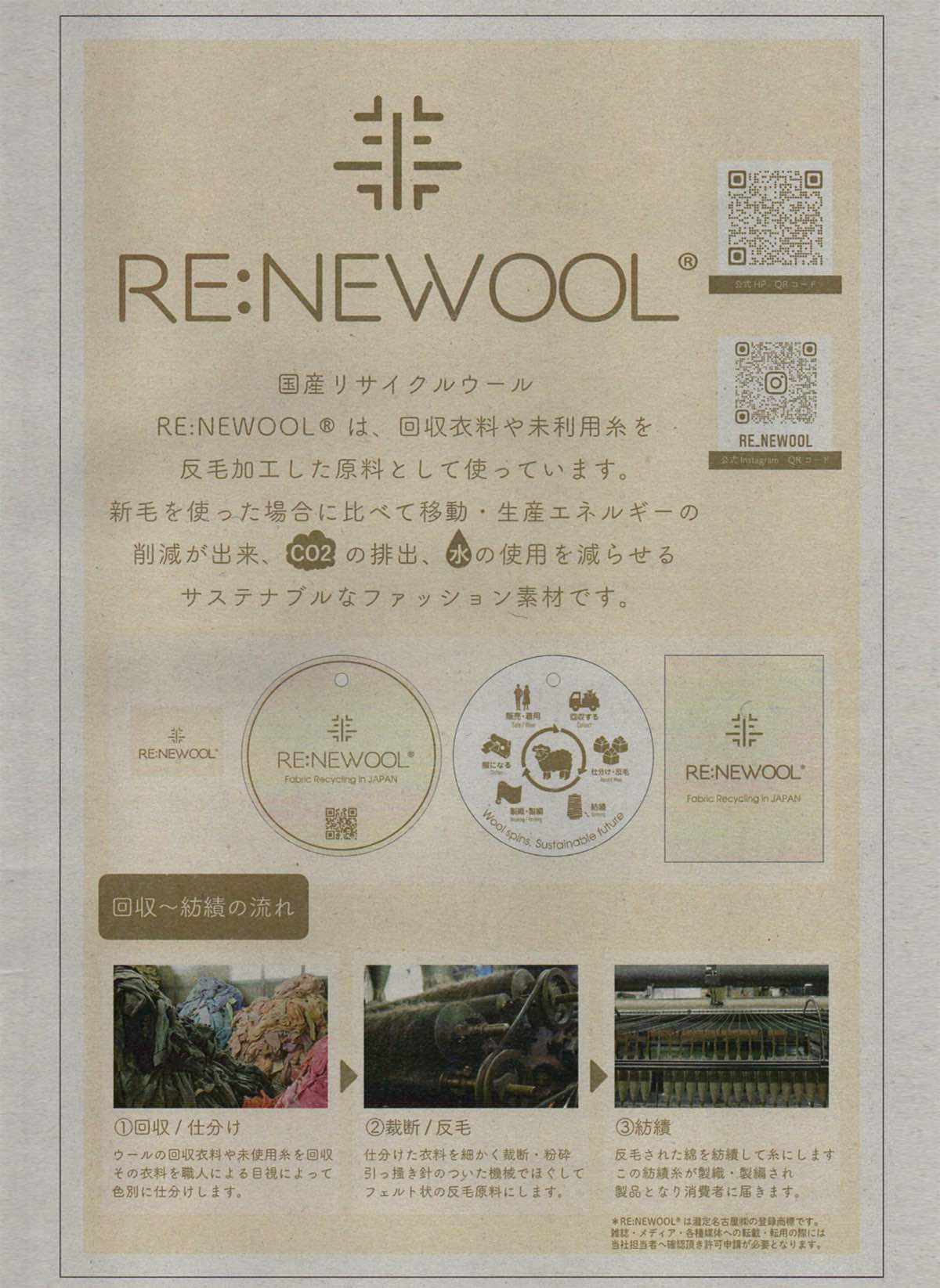 ーEcology&Sustainabilityー 原料調達、反毛、紡績、織布、整理、全ての工程を日本国内で行っているリサイクル紡毛素材“リニュール”。紡績時にブレンドされるポリエステル原料は、国産のリサイクルポリエステルを選定。古くから伝わる羊毛の循環・再生の技術を活かしたエコロジーな逸品です。※紡績ロット毎に大きな色差が生じます。ご了承お願いします。※天然繊維特有のネップ等が目立つ場合がありますが、素材特性としてご理解お願いします。※環境にやさしいリサイクル原料を使用しているため、混用率にはバラつきが生じます。※スポンジングやブレス等を実施される場合は事前に充分なテストを行ってください。形状変化や寸法変化についての責任は負いかねますので、ご了承お願い致します。※素材特性上、引張強度、滑脱抵抗力など当社基準未達項目がございます。※商品名の転用は原則お断りしています。