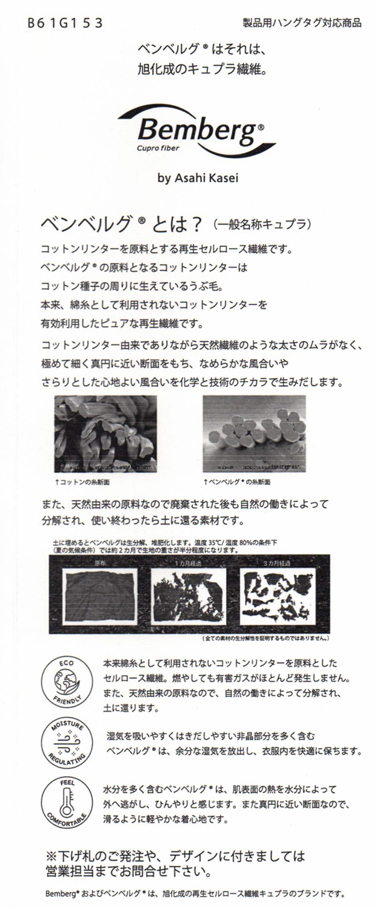 吸放湿性に優れたベンベルグ®?を使用した滑りの良い滑らかな風合いが特徴です。フィブリル加工による繊細なピーチタッチとリラックス感のある洗い感を合わせもち、適度な透け感と繊細な綾目が上品な薄手素材。ベンベルグ®?は綿糸として利用されないコットンリンターを有効利用した旭化成の再生セルロース繊維キュプラのブランドです。