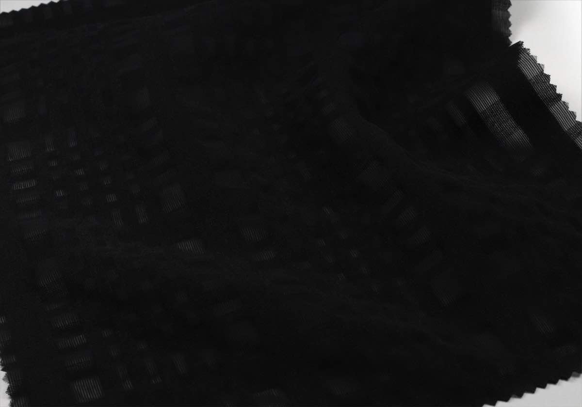強撚したMVSタイプの再生繊維(セルロース)をタテヨコに使うことで、さらっとしたドライタッチはそのままに、糸の収縮差を利用して凹凸のあるチェック素材に仕上げました。