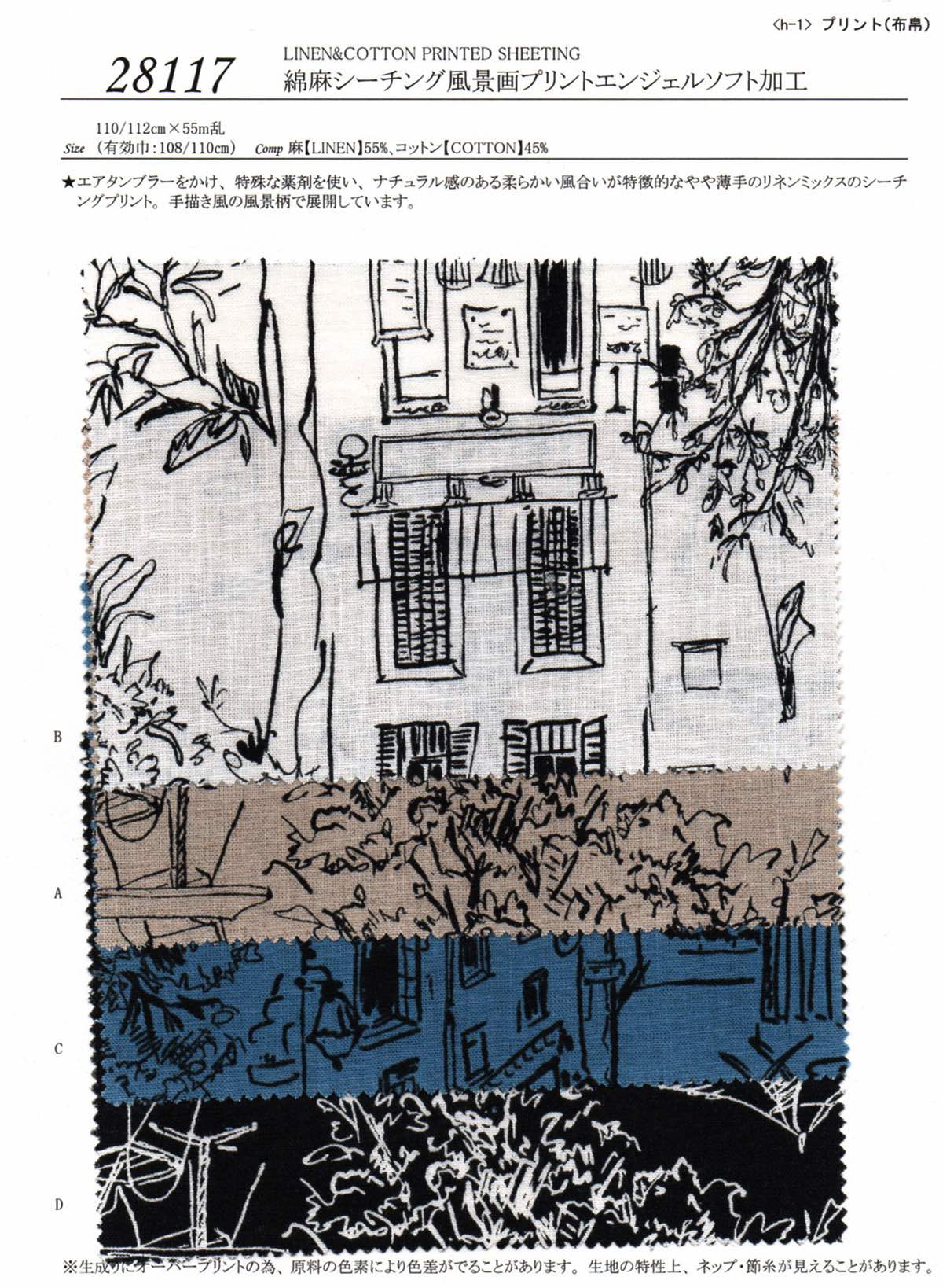 ★エアタンブラーをかけ、特殊な薬剤を使い、ナチュラル感のある柔らかい風合いが特徴的なやや薄手のリネンミックスのシーチングプリント。