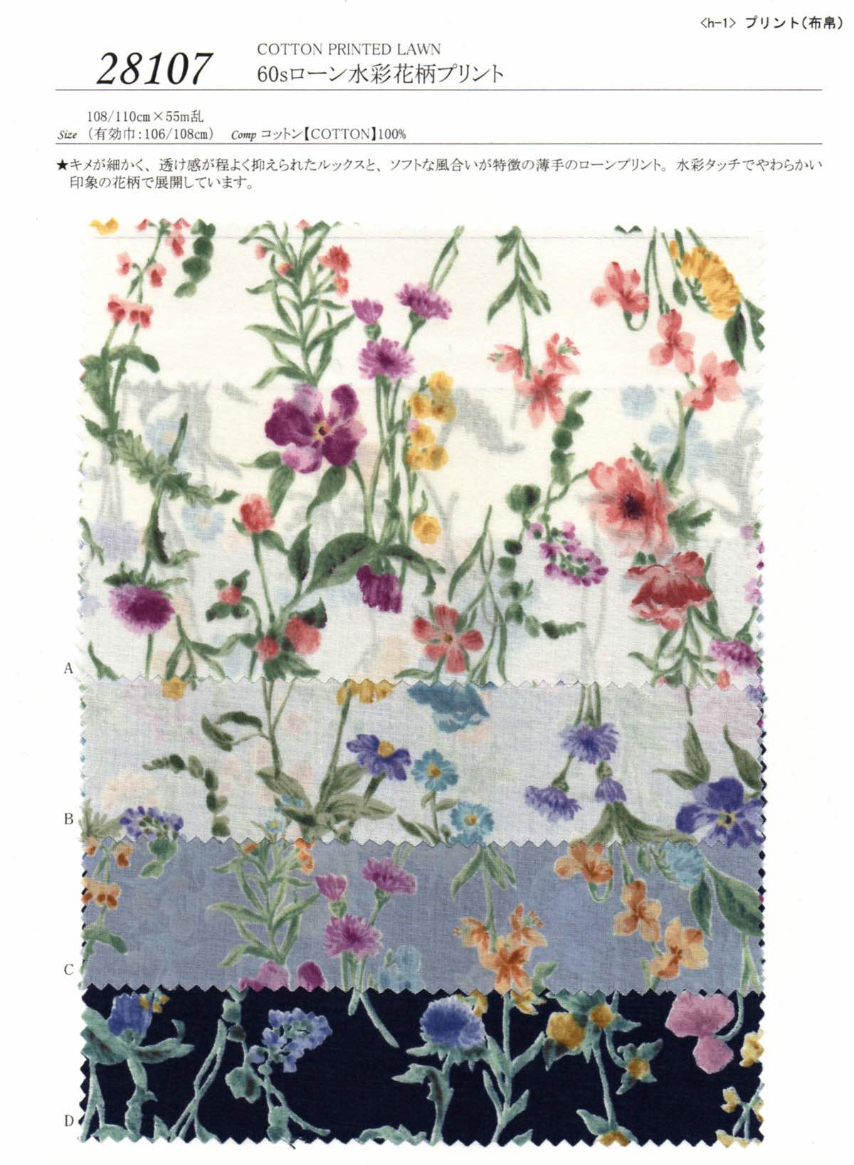★キメが細かく、透け感が程よく抑えられたルックスと、ソフトな風合いが特徴の薄手のローンプリント。