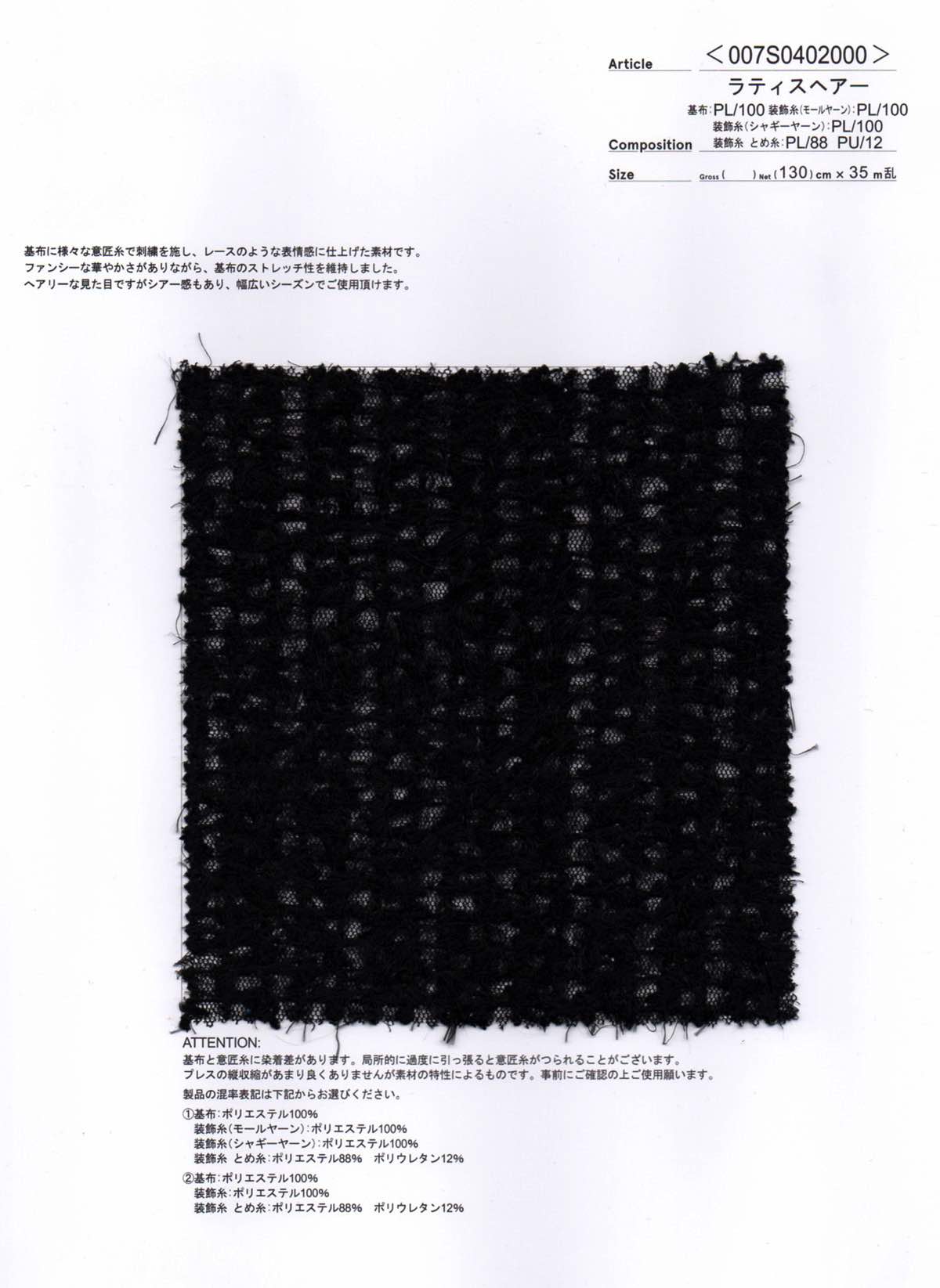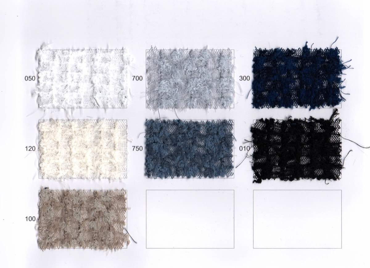 基布:ポリエステル100 装飾糸(モールヤーン):ポリエステル100 装飾糸(シャギーヤーン):ポリエステル100 装飾糸とめ糸:ポリエステル88/ポリウレタン12