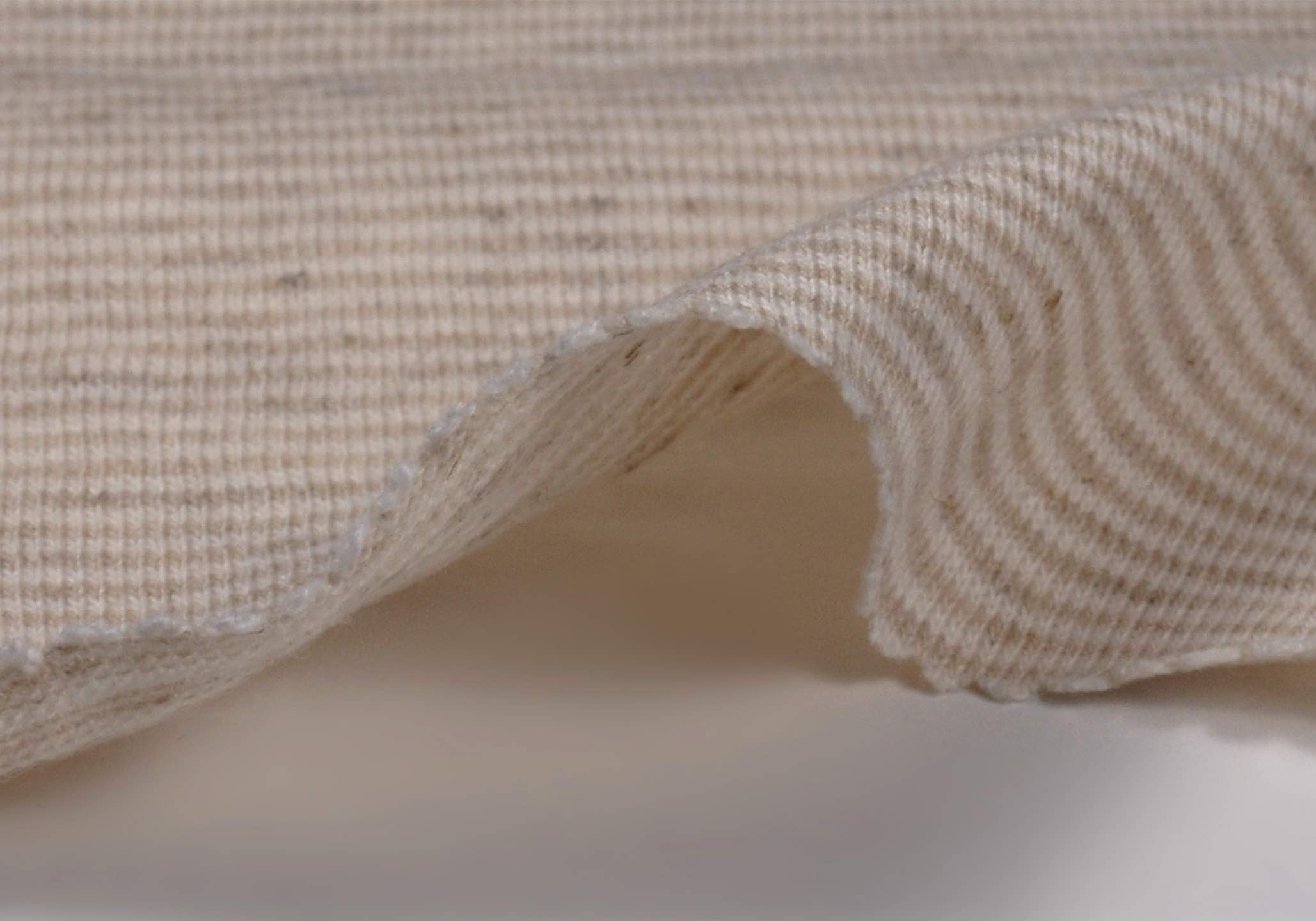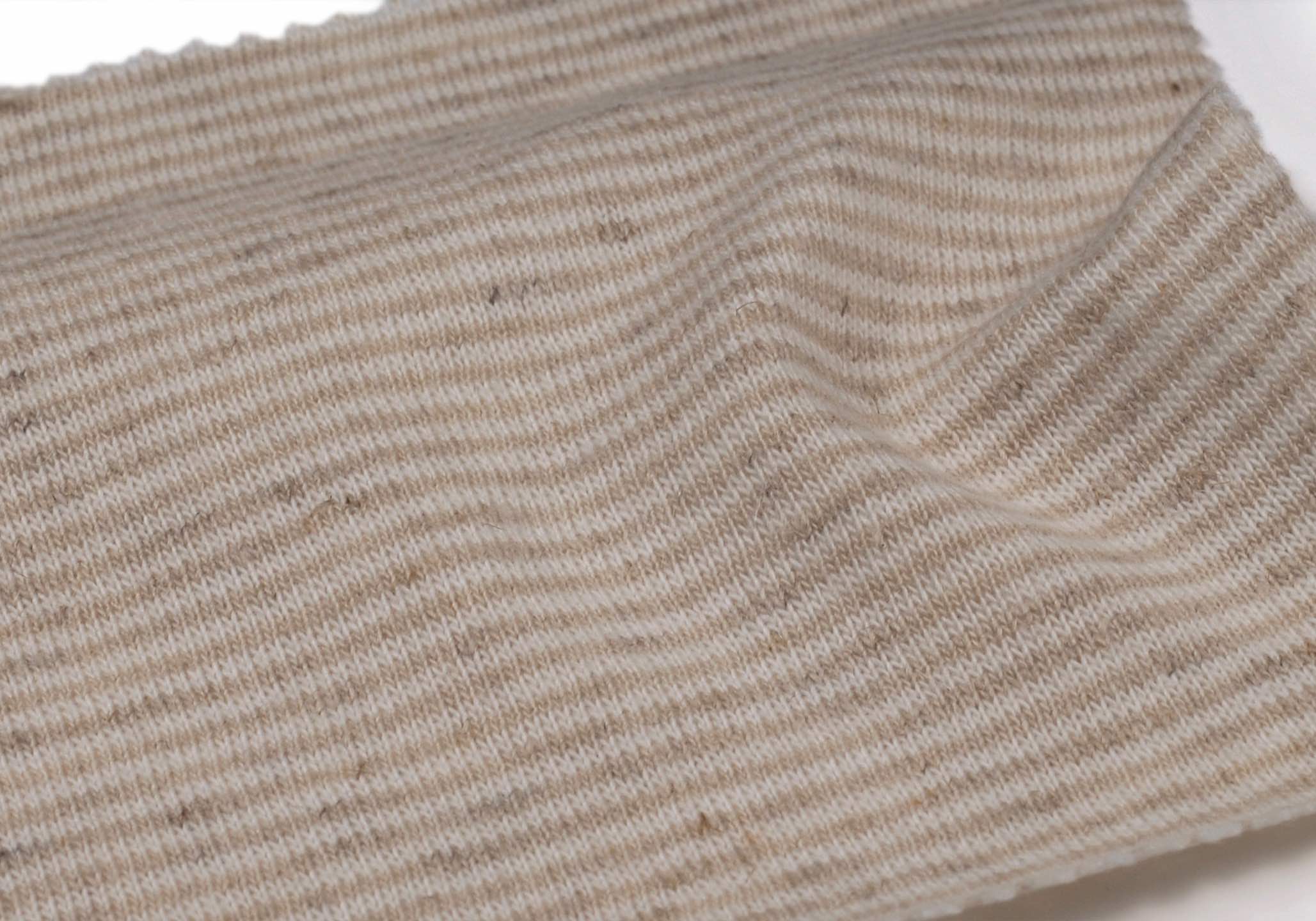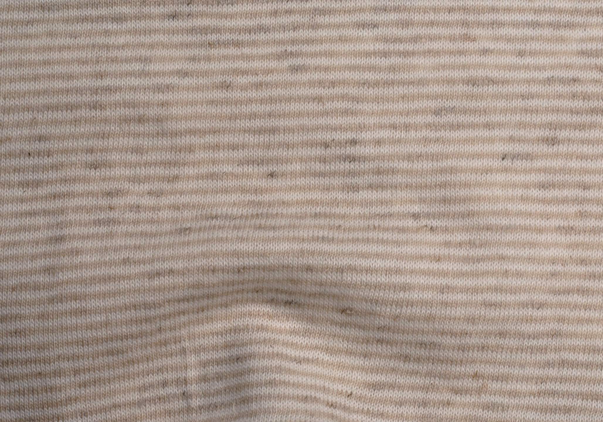 綿/ヘンプ混紡糸を使用した天竺ボーダーはヘンプ特有の粗野感があり、味のある表情が特徴です。