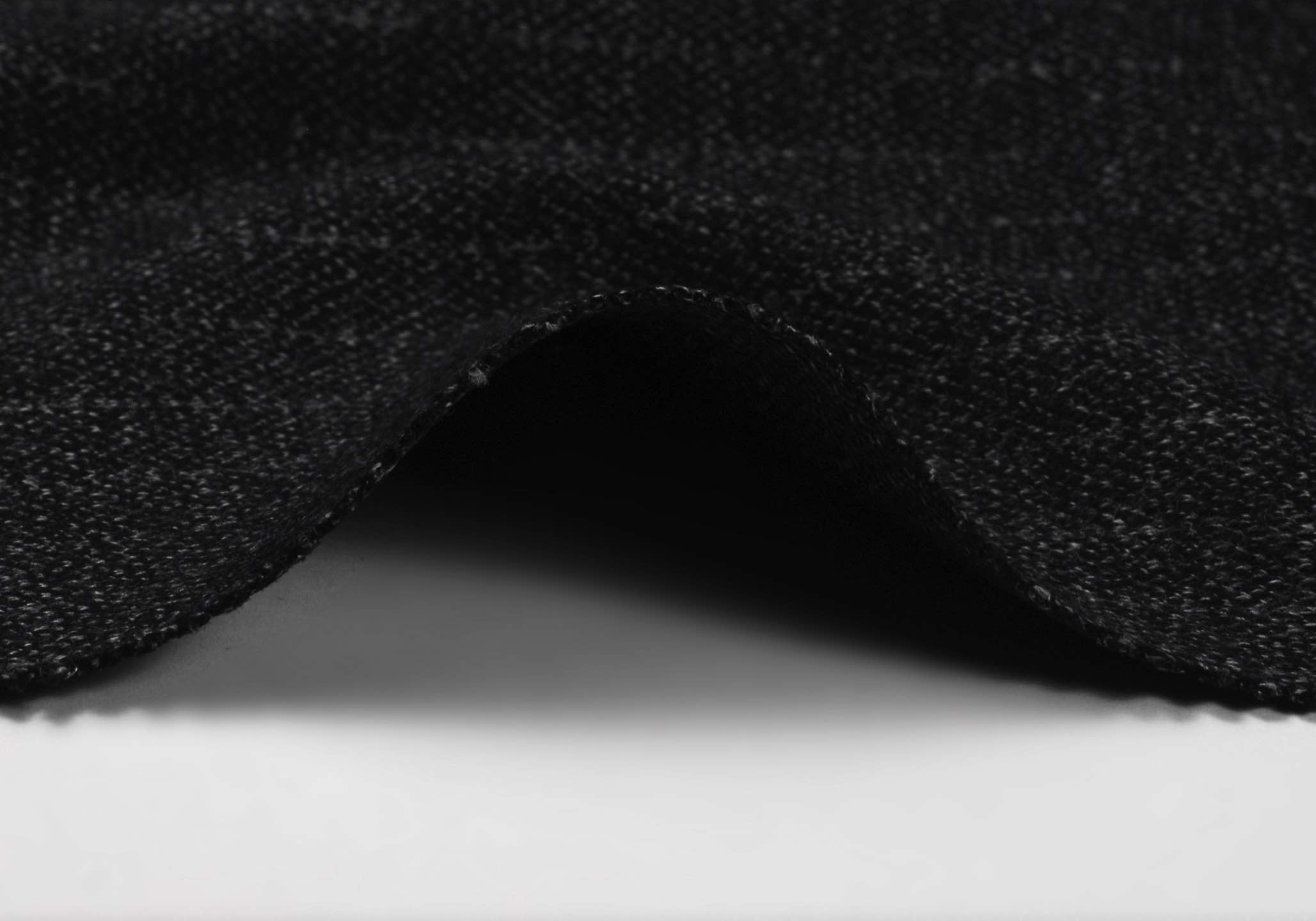 現職原料を精紡交撚して作り上げた杢糸を使用することで、色合いに奥行きをもたせた組織を霞ませた、シックな表情のウール混の編地です。
