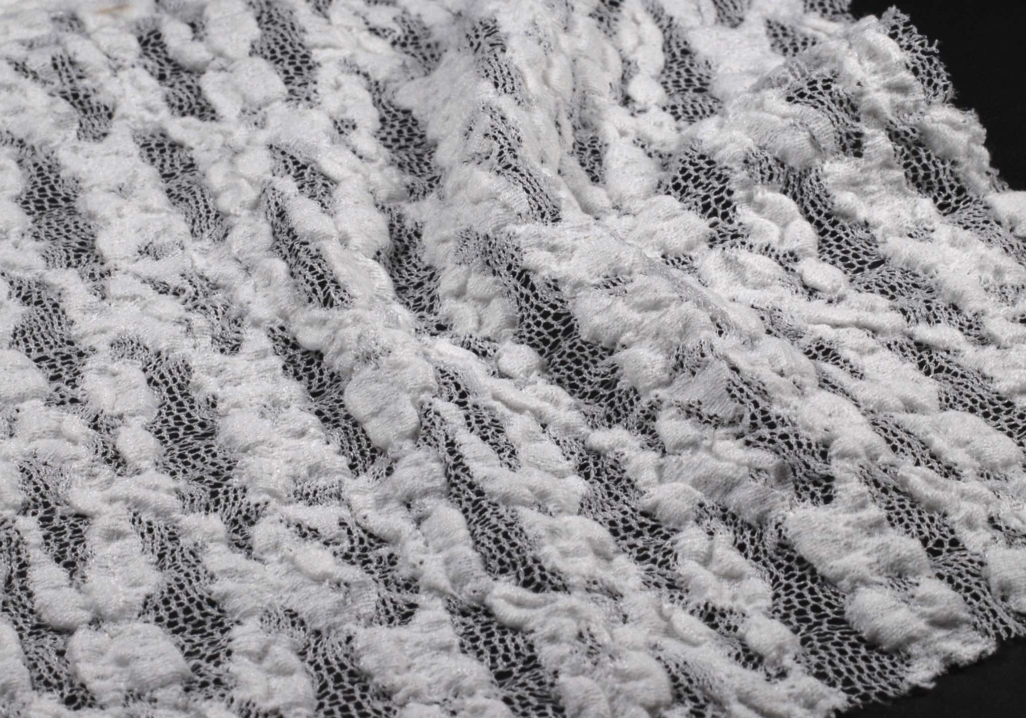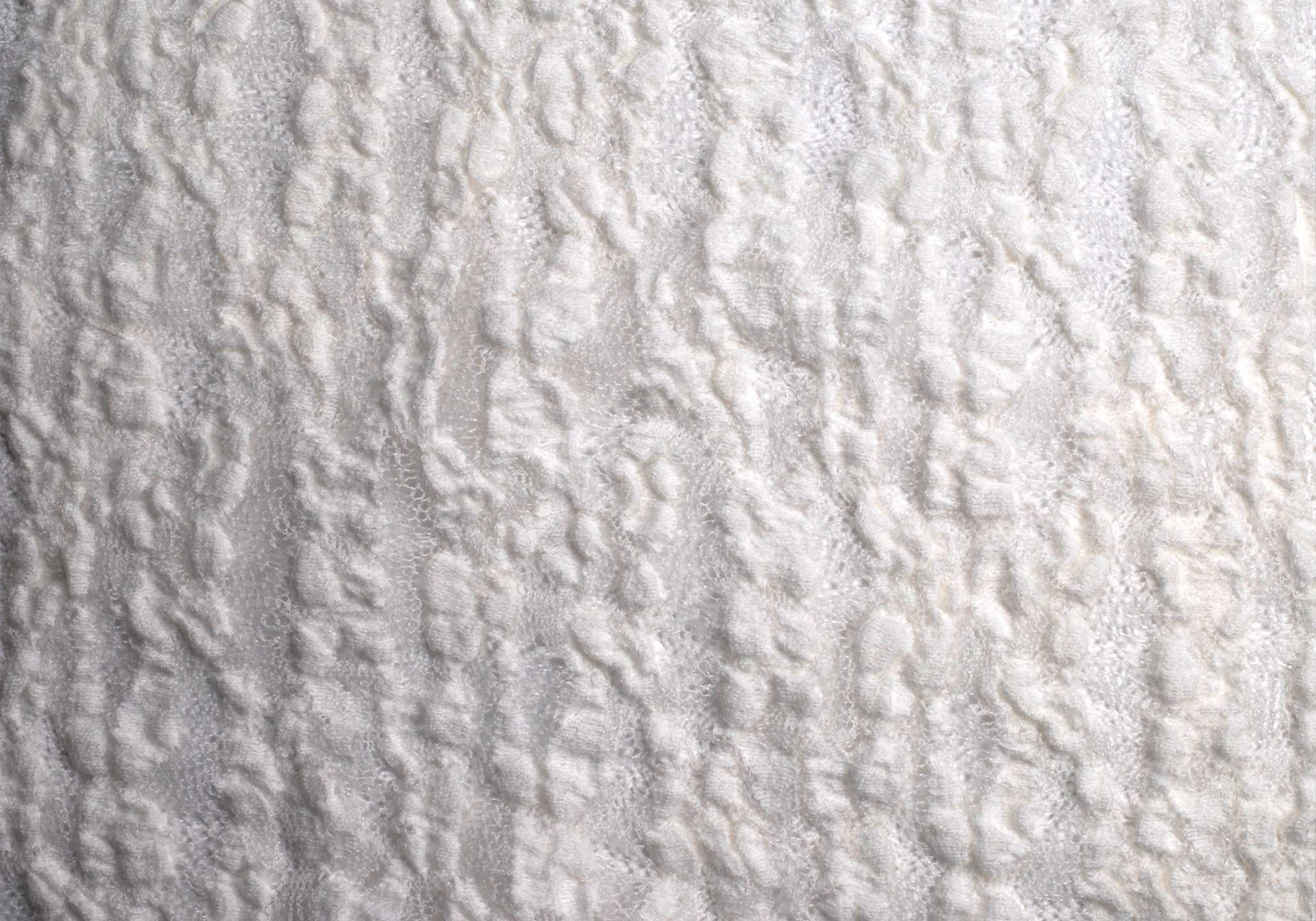 繊細な糸使いと独特の編み構造によって生まれる奥行のある表情感と、上品なシアー感が特徴で、視覚的にも印象的な仕上がりとなっています。